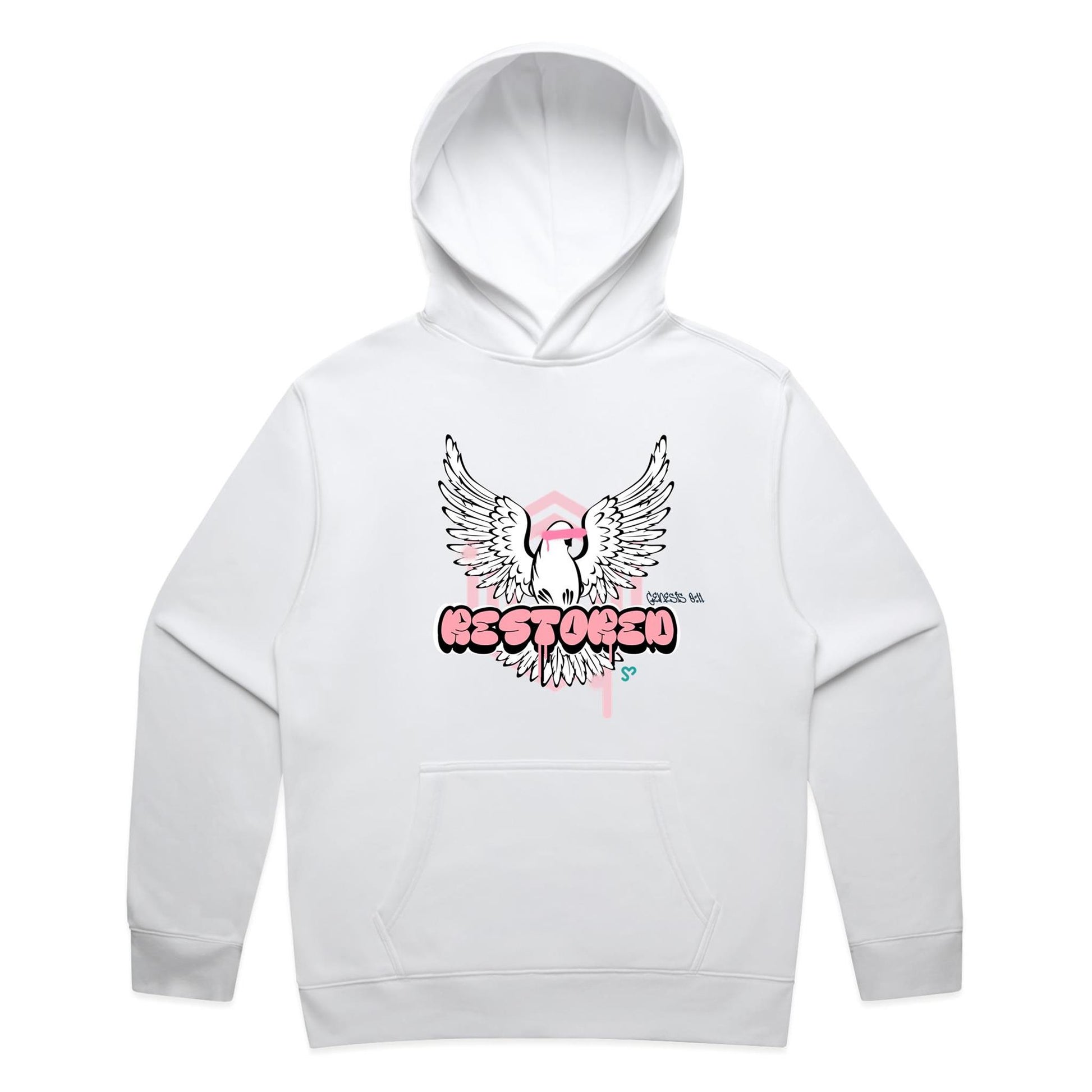 Graffiti-style "RESTORED" lettering across the dove like a banner of victory, while soft white and calm pink accents bring a sense of purity and light to this gritty, faith-infused streetwear piece. It’s where brokenness meets beauty — a reminder that restoration isn’t quiet, it’s for everyone.