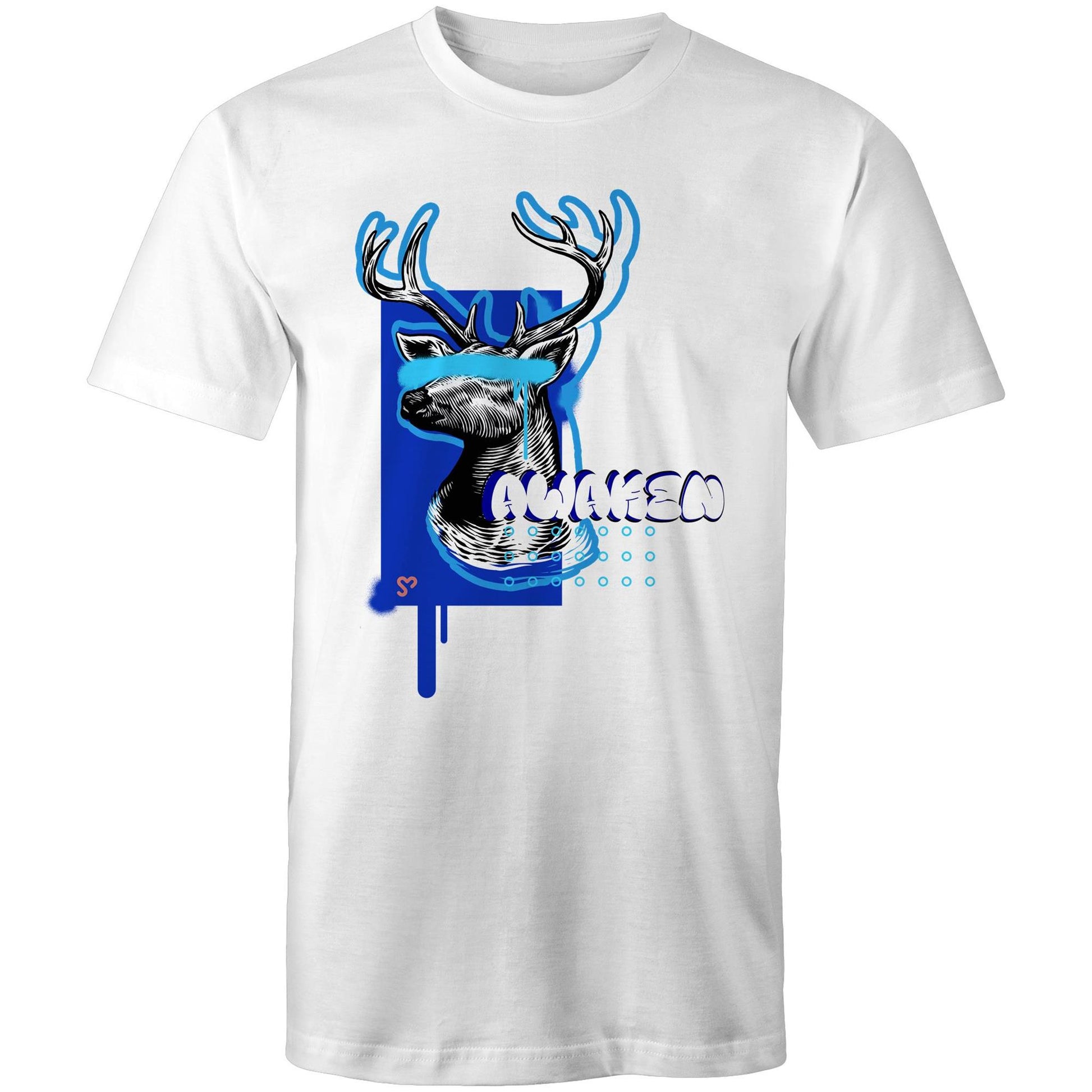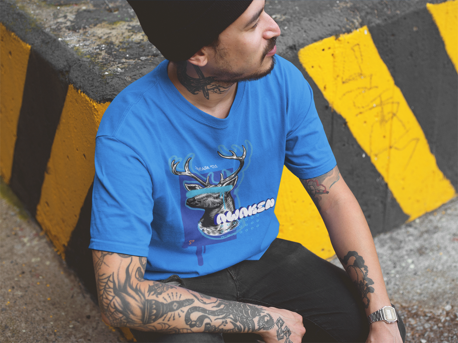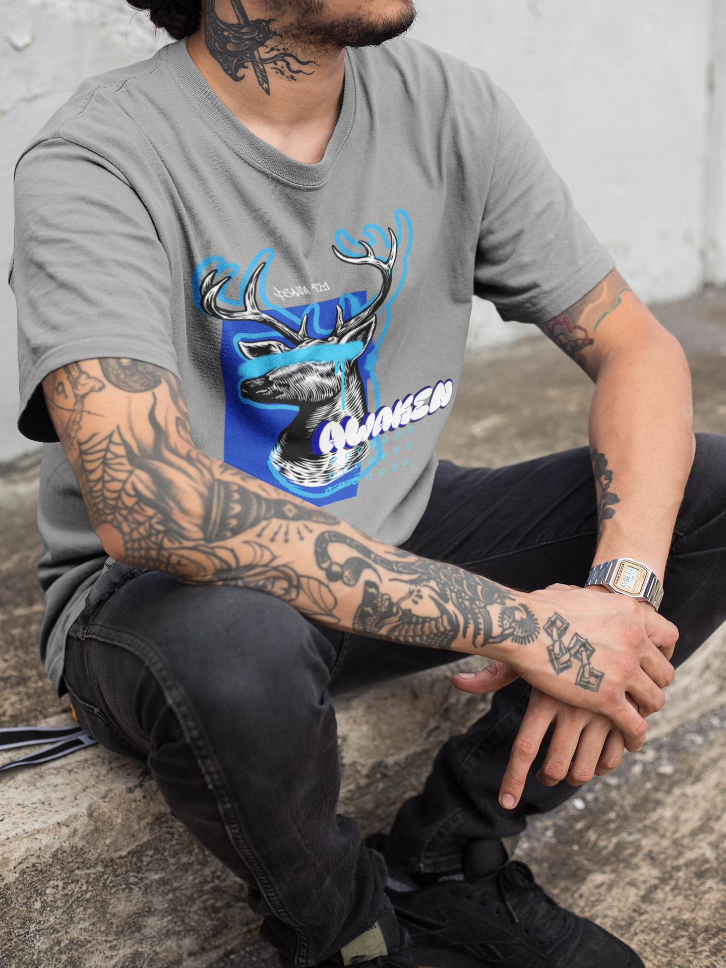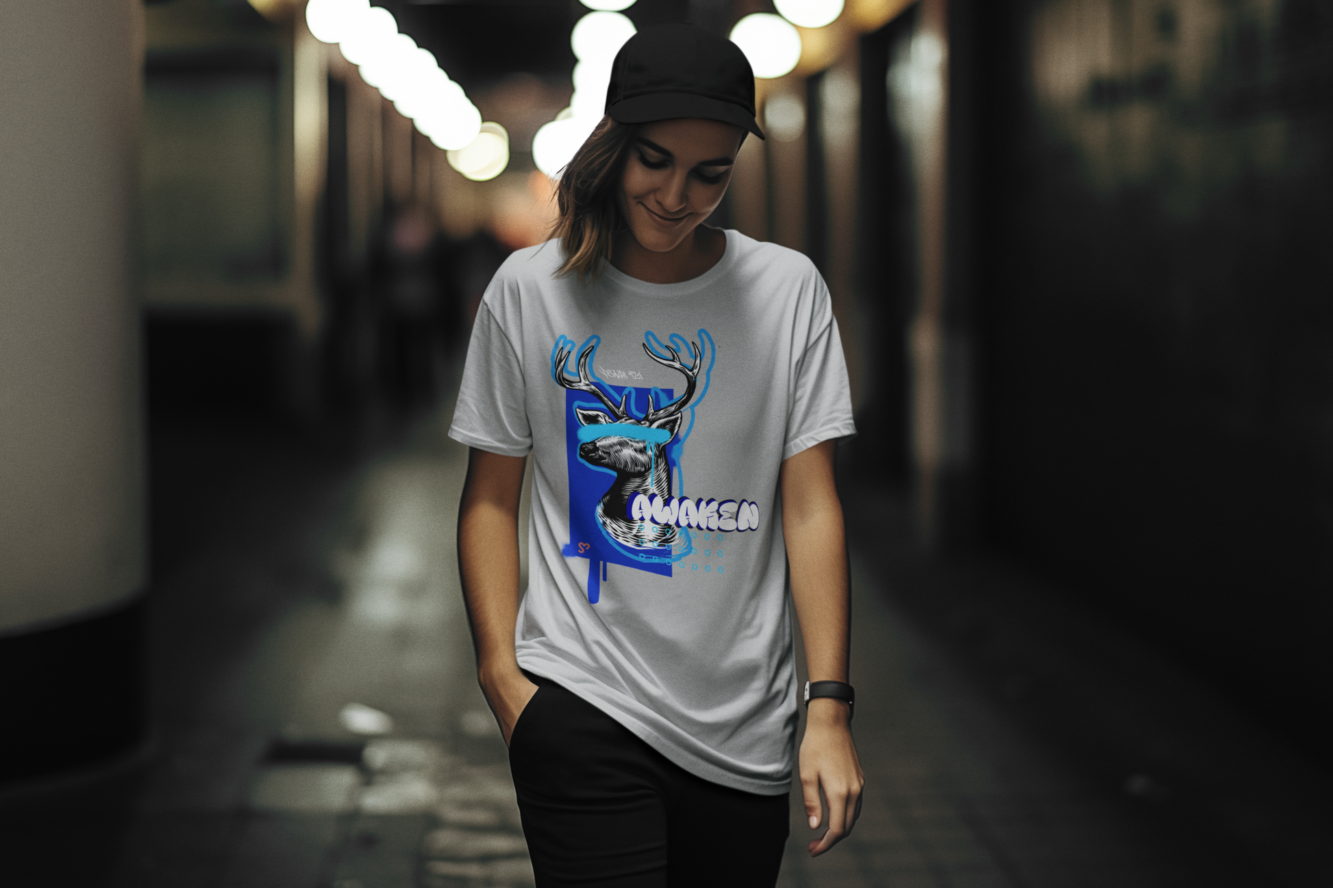 The AWAKEN Tee features a striking hand-drawn deer head with a bold blue eye-blind effect, symbolizing inner awakening and spiritual clarity. Inspired by Psalm 42:1, this design blends street art and faith-driven symbolism into a standout wearable statement.